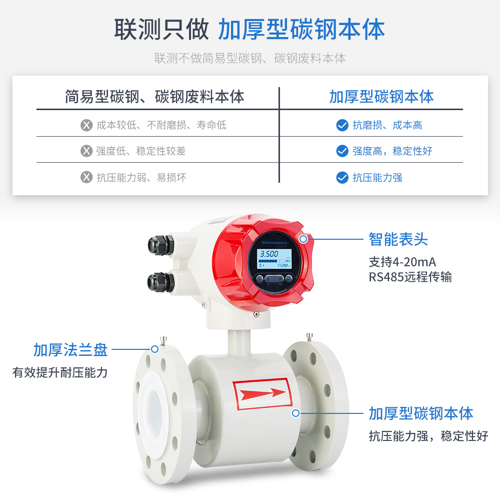 產品特點:智能升級表頭、防浪涌抗干擾電路、多層防銹漆 測量精度:測量值的±0.5%(流速≥1m/s);測量值的±0.5%±2mm/s(流速<1m/s) 輸出信號:電流(4~20mA)、脈沖、頻率、RS-485 防護等級:IP65